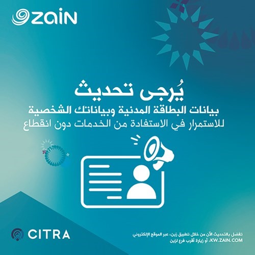دعت زين عملاءها الكرام إلى المبادرة بتحديث صلاحية بطاقاتهم المدنية وبياناتهم الشخصية لدى أنظمة الشركة في أسرع وقت ممكن لضمان استمرارية الخدمة، وذلك تطبيقا للتعليمات واللوائح الصادرة عن الهيئة العامة للاتصالات وتقنية المعلومات.