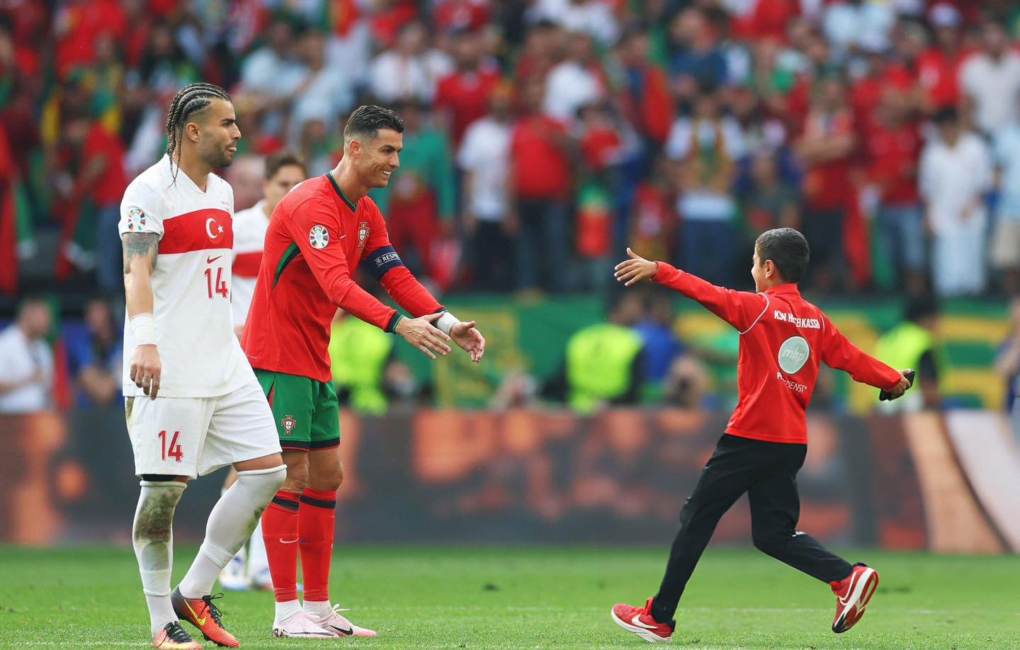اقتحم طفل أرضية ملعب مباراة البرتغال وتركيا، من أجل الحصول على صورة تذكارية مع قائد البرتغال كريستيانو رونالدو في المباراة التي جمعت الفريقين على ملعب سيجنال ايدونا بارك في ثاني جولات دور المجموعات للمجموعة السادسة في كأس الأمم الأوروبية “يورو 2024”.