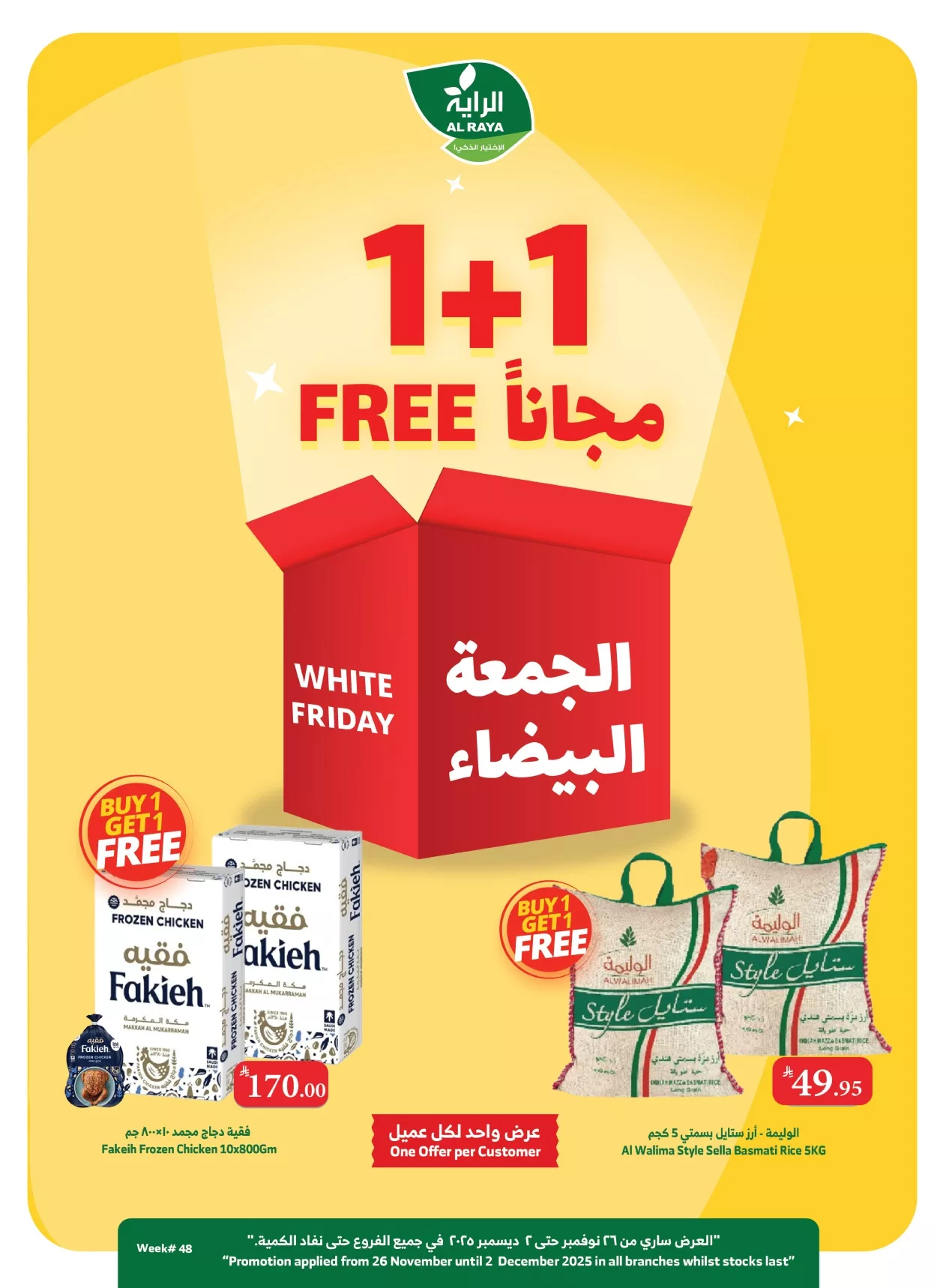 عروض أسواق الراية في الجمعة البيضاء الأربعاء 26/11/2025 تضم أجهزة منزلية تشمل أجهزة تقطيع كهربائية ومحضرات وشوايات لوحية كبيرة وأجهزة بخار للطهي ومكائن تحضير قهوة ثم تمتد السلع الغذائية إلى الكرفس الطازج والملفوف الصغير والتوت البري والمانجو والجبنة المدخنة و اللحوم مع عرض 1+1 مجانا تسوق ووفر الآن .