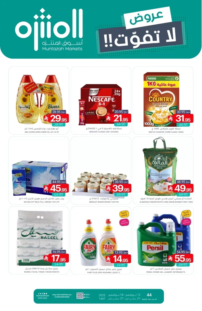 عروض أسواق المنتزه الأربعاء 21 جماد الاول 1447هـ تقدم تخفيضات على الأجبان والفواكه الموسمية والزيوت النباتية والعسل الطبيعي والفواكه المجففة والمعلبات والحبوب والأرز والدقيق و بتوفر كمان الأجهزة المنزلية التي تضم أفران الطبخ وأجهزة العجن وأفران الخبز ومكائن القهوة ومضارب الخلط باقل الاسعار .