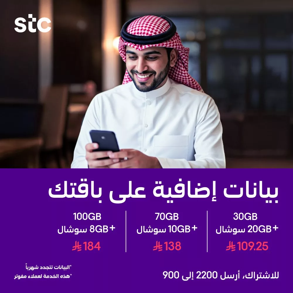 • سعر باقة 100 جيجا + 8 جيجا سوشال بـ 184 ريال سعودي