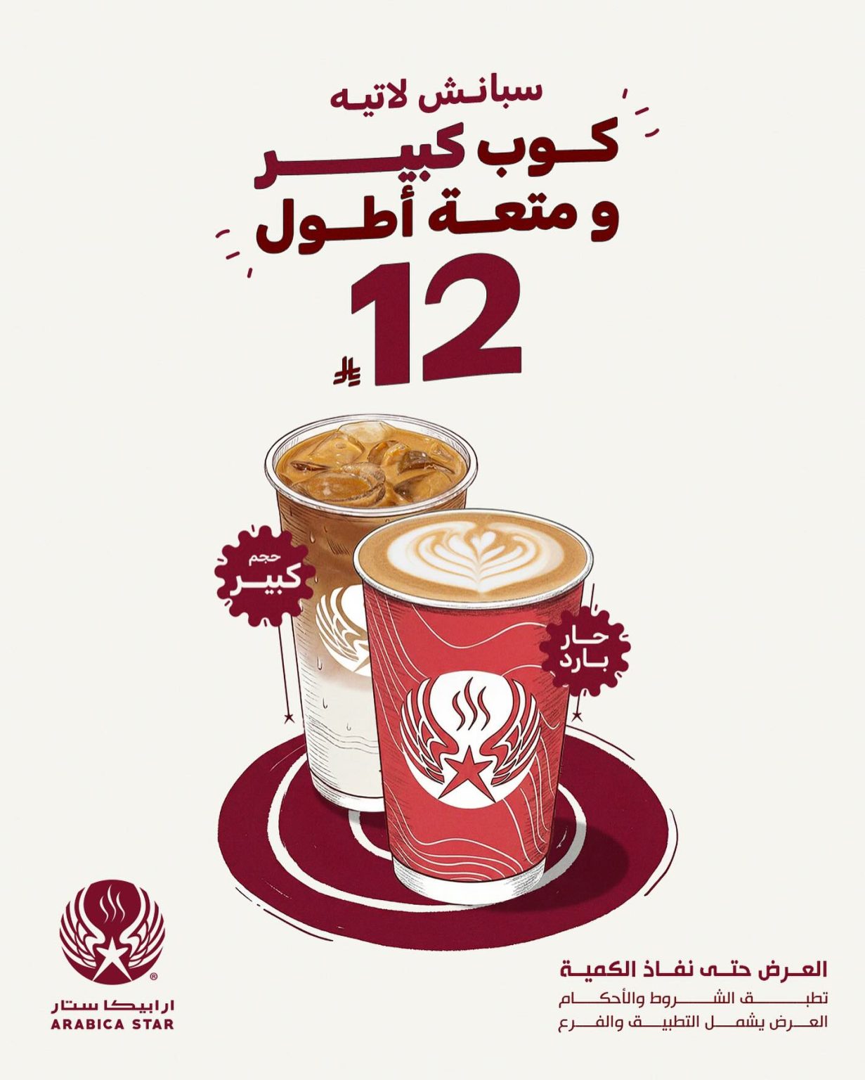 عروض ارابيكا ستار سبانش لاتيه كبير حار او بارد بـ 12 ريال فقط افضل العروض المميزه في ارابيكا كافيه في السعودية بأفضل العروض المميزه