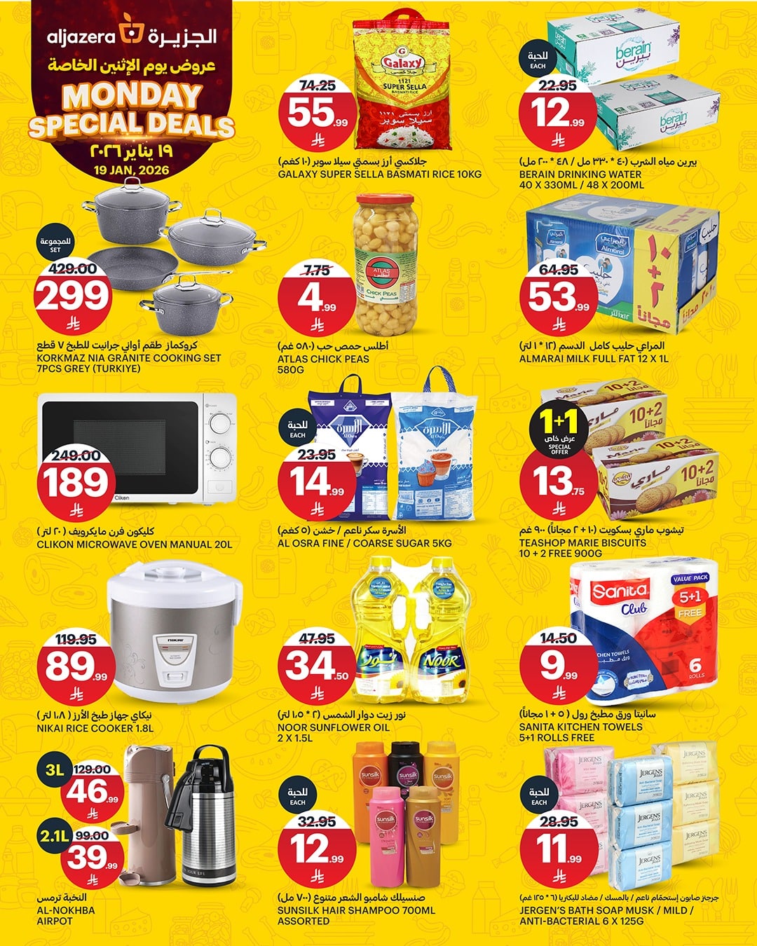 قدم لكم احدث عروض اسواق الجزيرة الاثنين 19 يناير 2026 – 30 رجب 1447هـ و تحتوي علي الخضروات واللحوم ومنتجات الألبان منها الذرة الحلوة والبطاطا الحلوة والكرنب والجبن والزبدة غير المملحة وسمك الرنجة المدخن وصدور الدجاج الكاملة والمقطعة والفرايز والمنتجات المجمدة باسعار تنافسية مناسبة للجميع .