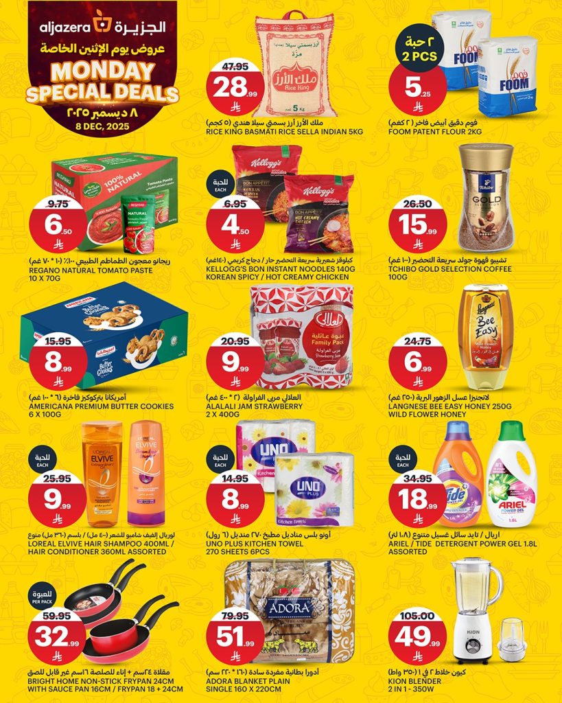 بنقدم ليكم اليوم احدث عروض اسواق الجزيرة الاثنين 8-12-2025 و بتحتوي علي تشكيلة من الخضروات و الفواكه الطازجة و بجانب ذلك توفر ايضا مجموعة من المنتجات الغذائية و اللحوم الطازجة و في عرض حصري متاح اليوم فقط باقل الاسعار انتظرونا في تغطية مباشرة و حصرية لـ احدث عروض رمضان 2026 علي موقعكم عروض توداي .