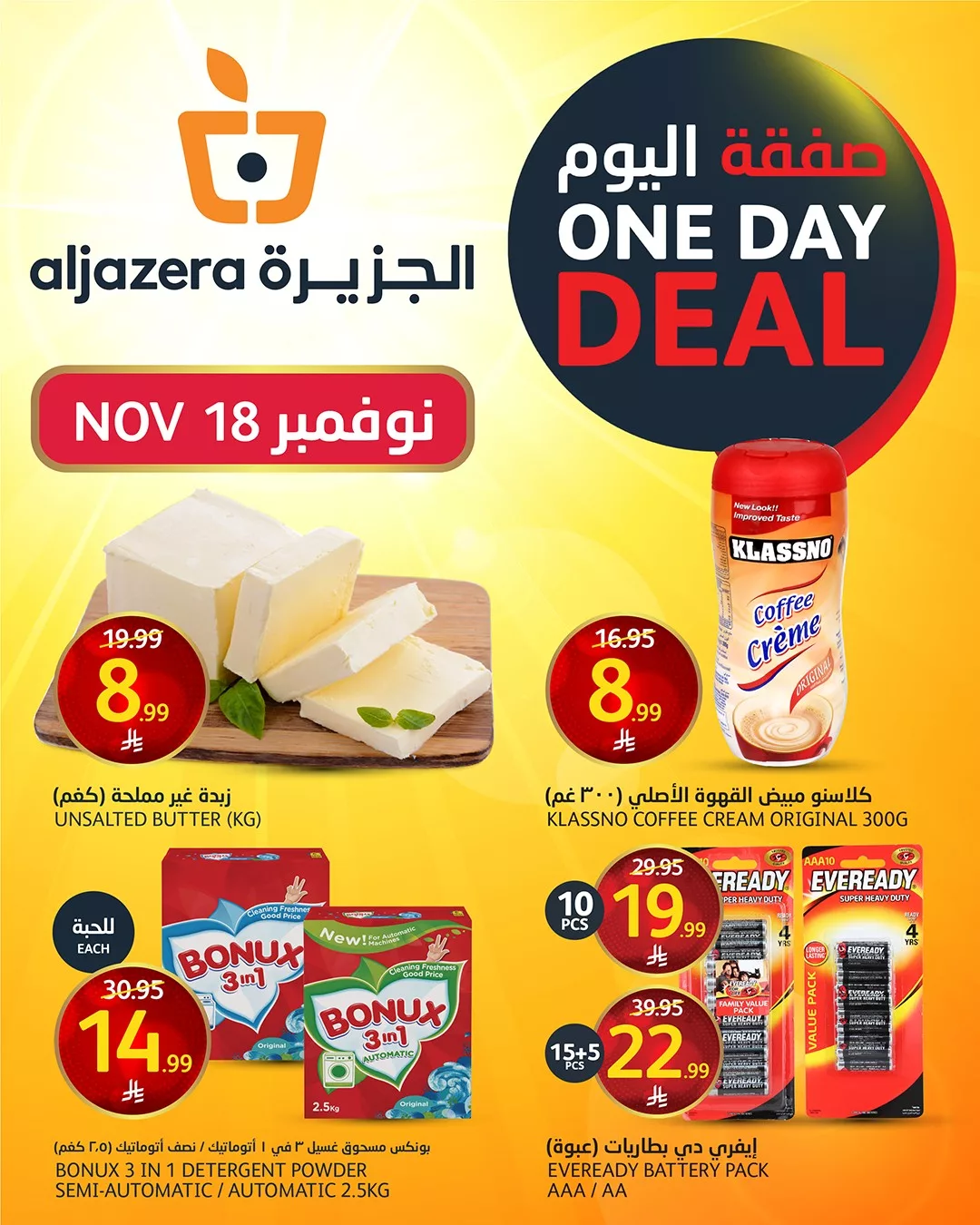 نقدم لكم اليوم احدث عروض اسواق الجزيرة بتاريخ الثلاثاء 18-11-2025 و تحتوي علي منتجات متنوعة منها زبدة غير مملحة و ايفردي دي بطاريات و بتوفر كمان بونكس مسحوق غسيل و غيرها من المنتجات في عرض حصري متاح اليوم فقط و باقل الاسعار تابعونا لمعرفة كل جديد عن عروض السعودية .