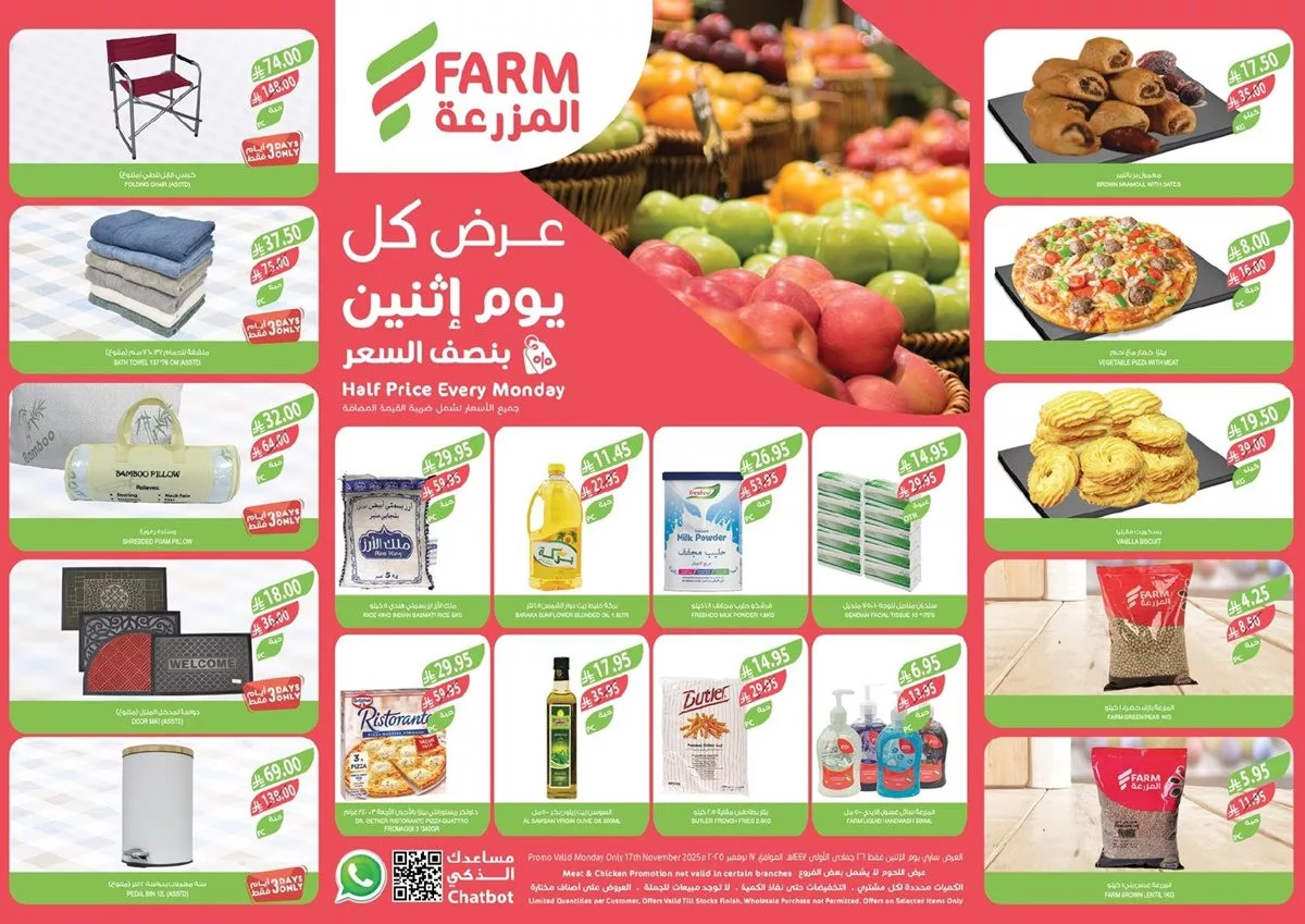 عروض اسواق المزرعة الطازج لجميع الفروع الاثنين 17-11-2025 بتقدم ليكم اليوم  الخضروات الطازجة مثل الذرة والجزر والبطاطا الحلوة بالإضافة إلى البصل والبرتقال وتحتوي أيضا على جبنة موزاريلا وجبنة مدخنة وزبادي تركي مع صلصة الطماطم وأدوات التنظيف وزيت الذرة ومسحوق الحليب ومنتجات الصابون السائل والسكر والأرز