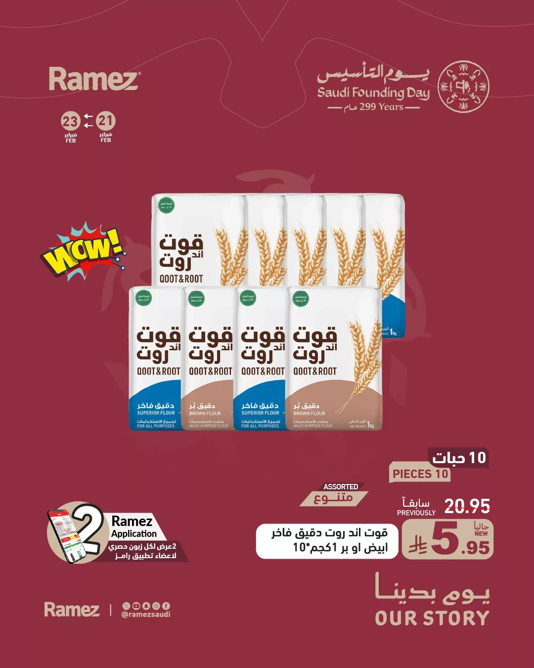 تضم ايضا اسواق رامز السعودية في يوم التاسيس السعودي اللحوم والأسماك وبيض المائدة والتمور والحلويات والمكسرات والسلع الاستهلاكية الأساسية كالأرز والزيت والحليب و أدوات منزلية