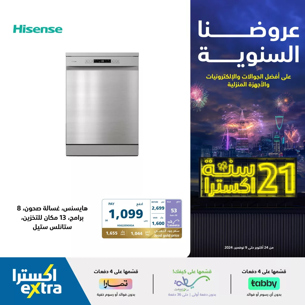 تأتي عروض اكسترا السنوية بمناسبة مرور 21 سنة على تأسيسها مما يجعلها فرصة استثنائية للاستفادة من التخفيضات الكبيرة على مختلف المنتجات بالإضافة إلى التسهيلات المالية التي توفرها من خلال خيارات الدفع المرنة عبر تمارا وتابي ما يمنح العملاء مرونة في التسديد بدون فوائد إضافية.