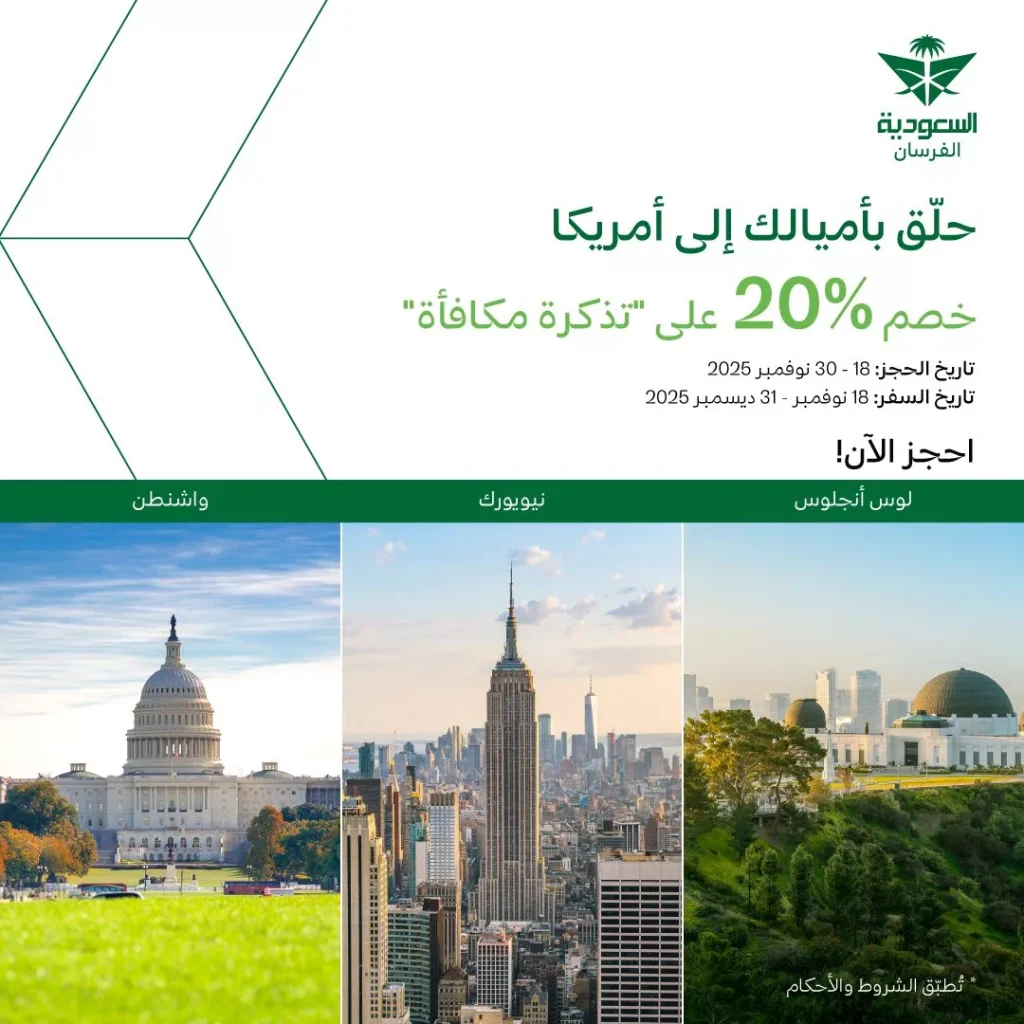 - اقوى العروض مع خصم 20% على تذكره مكافأه و سافر بأميالك إلى أمريكا وأوروبا