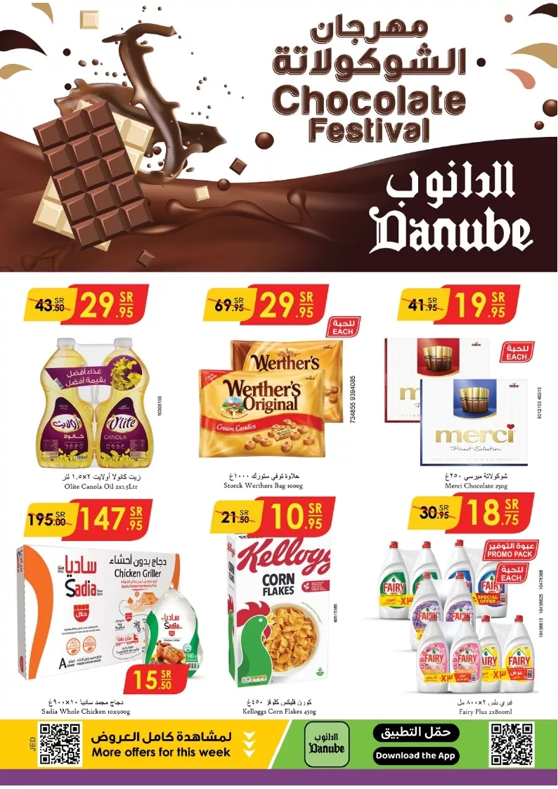تقدم الدانوب جدة تشكيلة متنوعة من العروض المميزة على العديد من المنتجات الغذائية والمأكولات الطازجة ضمن مهرجان الشوكولاتة و يمكنكم الاستفادة من التخفيضات الكبيرة على المنتجات المشهورة مثل زيت كانولا أوليت وشوكولاتة ميرسي بالإضافة إلى عروض الخضار والفواكه