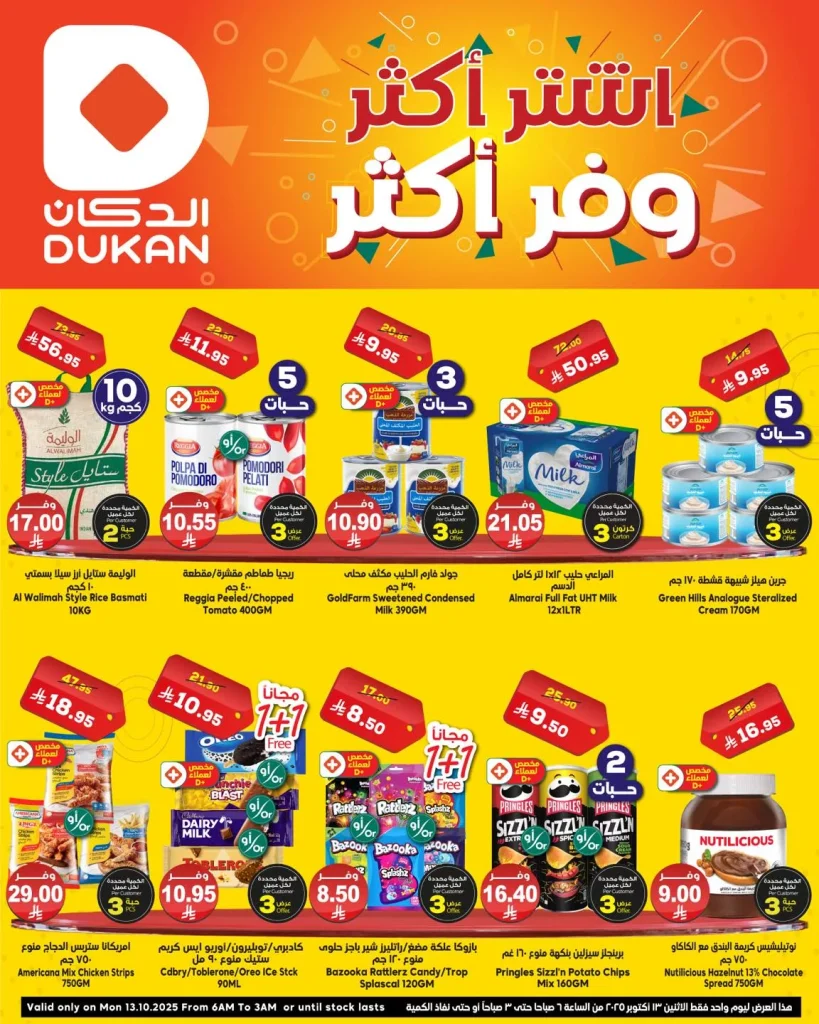عروض الدكان جدة الاثنين 13 أكتوبر 2025 تقدم مجموعة رائعة من المنتجات الغذائية اضافة على أصناف الحليب والحلويات والمقرمشات و توفر مواد غذائية بأسعار مخفضة مثل الأرز والطماطم والمعلبات بالإضافة إلى المنتجات الطازجة من الحليب والكريمة والبسكويت و باقل الاسعار و ذلك لفترة محدودة لا تفوت الفرصة .