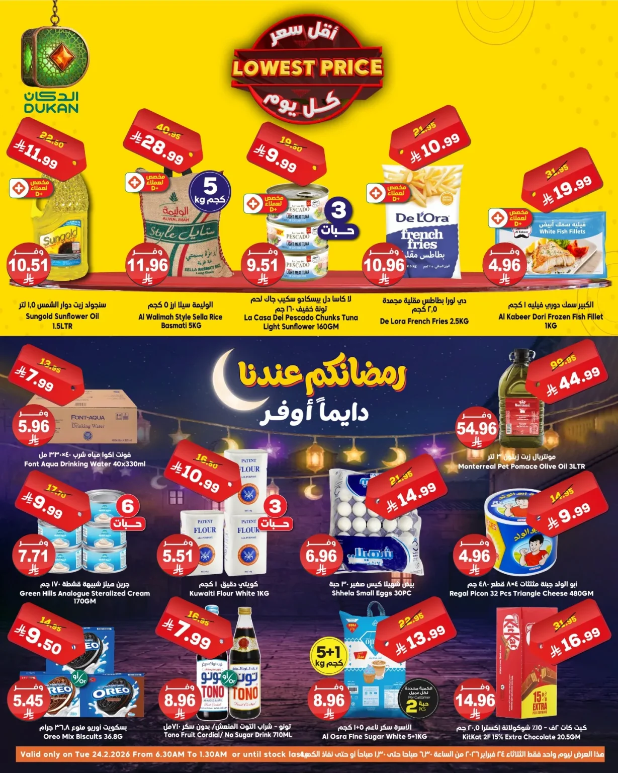 نقدم لكم احدث عروض الدكان جدة الثلاثاء 24 فبراير 2026 الموافق 6 رمضان 1447هـ و تحتوي علي منتجات غذائية اساسية مثل الأرز والزيت والحليب البودرة والدجاج المجمد والتونة