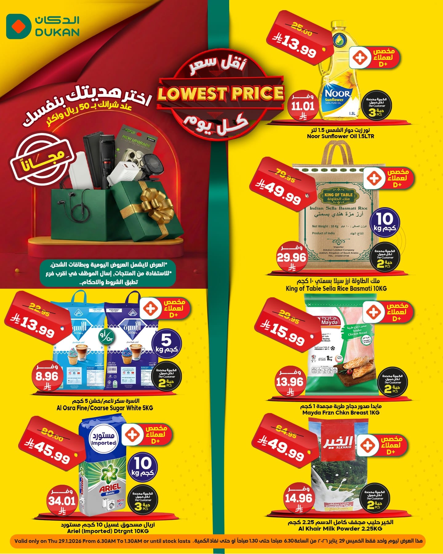 نستعرض معاكم عروض الدكان جدة الطازج الخميس 29-1-2026 الموافق 10 شعبان 1447هـ و تحتوي علي تشكيلة من المنتجات الغذائية و الاستهلاكية المتنوعة منها زيت دوار الشمس و ملك الطاولة ارز بسمتي و بتوفر كمان مايدا صدور دجاج طرية و باسعار مناسبة للجميع فقط ابقوا معنا ليصلكم كل جديد