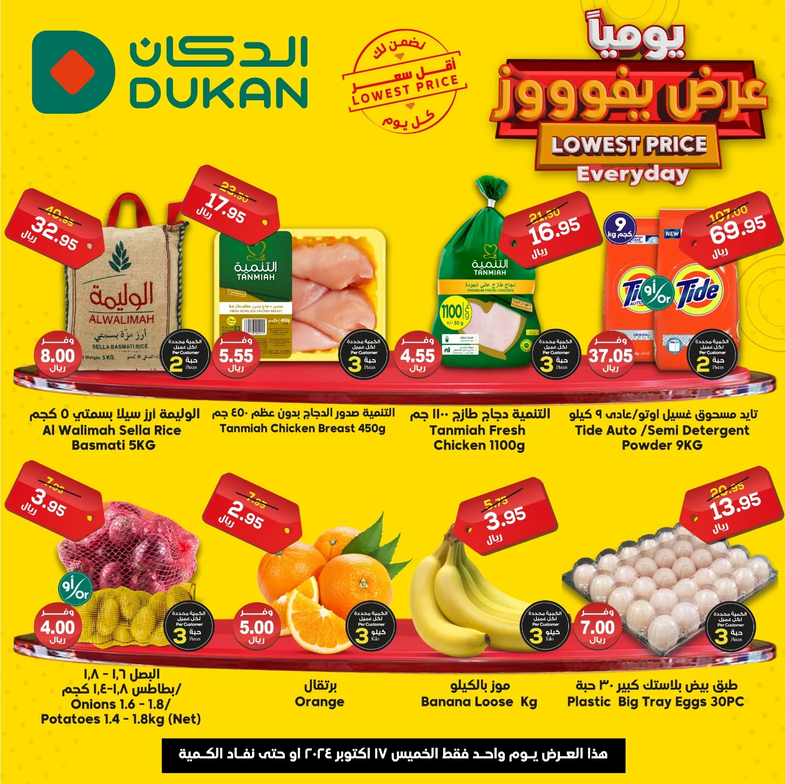 عروض الدكان جدة يوم الخميس 17 أكتوبر 2024 تشمل خصومات كبيرة على الخضروات والفواكه الطازجة مثل التفاح، الطماطم، والخيار. كما تشمل العروض تخفيضات على اللحوم المجمدة والأسماك الطازجة، مما يساعدك في تجهيز وجبات لذيذة وصحية بأسعار مخفضة.