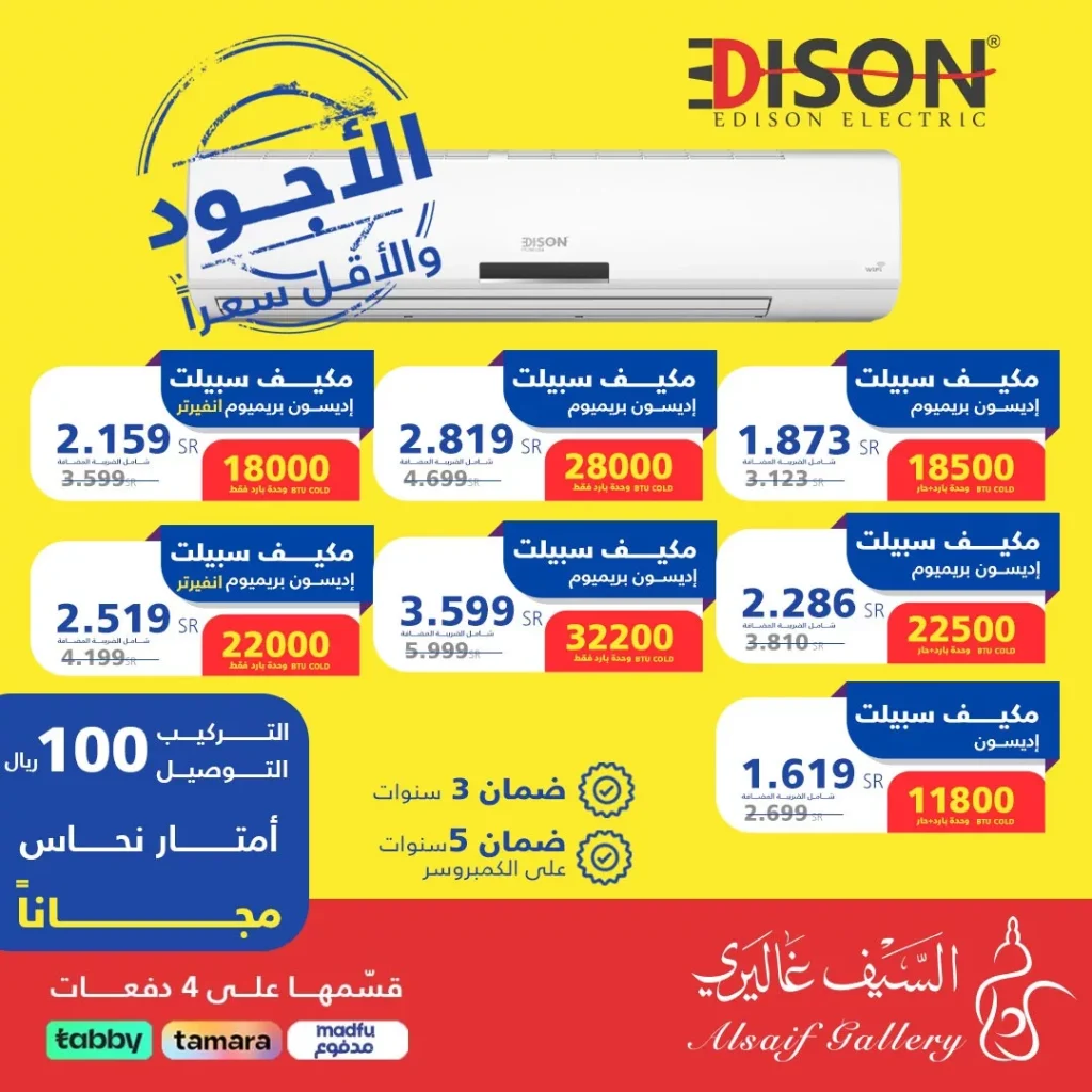 عرض السيف غاليري يقدم مكيفات سبليت إيديسون بمواصفات عالية وأسعار تنافسية بعد الخصم مع توفير تركيب مجاني وخدمة تمديدات نحاسية مجانا و العرض يشمل خيارات واسعة من قدرات التبريد والتدفئة مع ضمان شامل لمدة ثلاث سنوات وضمان خمس سنوات على الكومبريسور