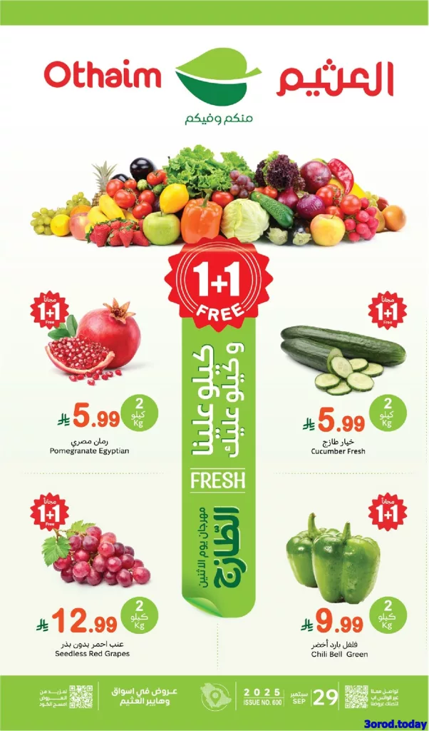 عروض العثيم الاثنين 29-9-2025 تبدأ من الفواكه والخضار الطازجة حيث تشمل رمان مصري وخيار طازج وعنب أحمر بدون بذور وفلفل بارد أخضر بجودة عالية بالإضافة إلى عروض الجملة على المانجو المصري والجوافة والبرتقال و تشمل أيضا عروض العثيم اليوم علي تشكيلات واسعة من منتجات الأجبان والألبان والمخللات واللحوم الطازجة