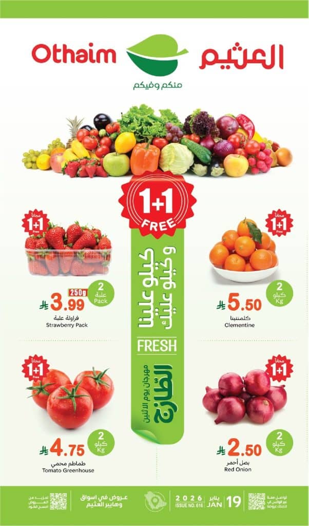 بنقدم ليكم احدث عروض العثيم الاثنين 19 يناير 2026 الموافق 30-7-1447هـ مهرجان الطازج كيلو عليك و كيلو علينا تسوق ووفر اقوي المنتجات الغذائية و الخضروات و الفواكه الطازجة بجانب ذلك تشمل ايضا عروض اسواق العثيم اشهي اصناف اللحوم و اجهزة المطبخ الرائعة و باسعار مميزة مع توفير 1+1 مجانا لا تفوت الفرصة