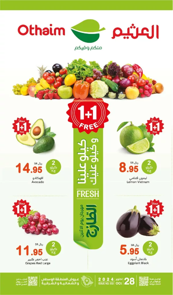 تقدم عروض العثيم الاثنين 28 أكتوبر 2024 مجموعة مميزة من المنتجات الطازجة ضمن مهرجان الطازج، حيث يتاح للعملاء الاستمتاع بصفقات 1+1 على عدة أصناف من الخضروات والفواكه بما يشمل الأفوكادو والليمون والعنب الأحمر الكبير والباذنجان الأسود تابعونا علي موقعكم عروض توداي .