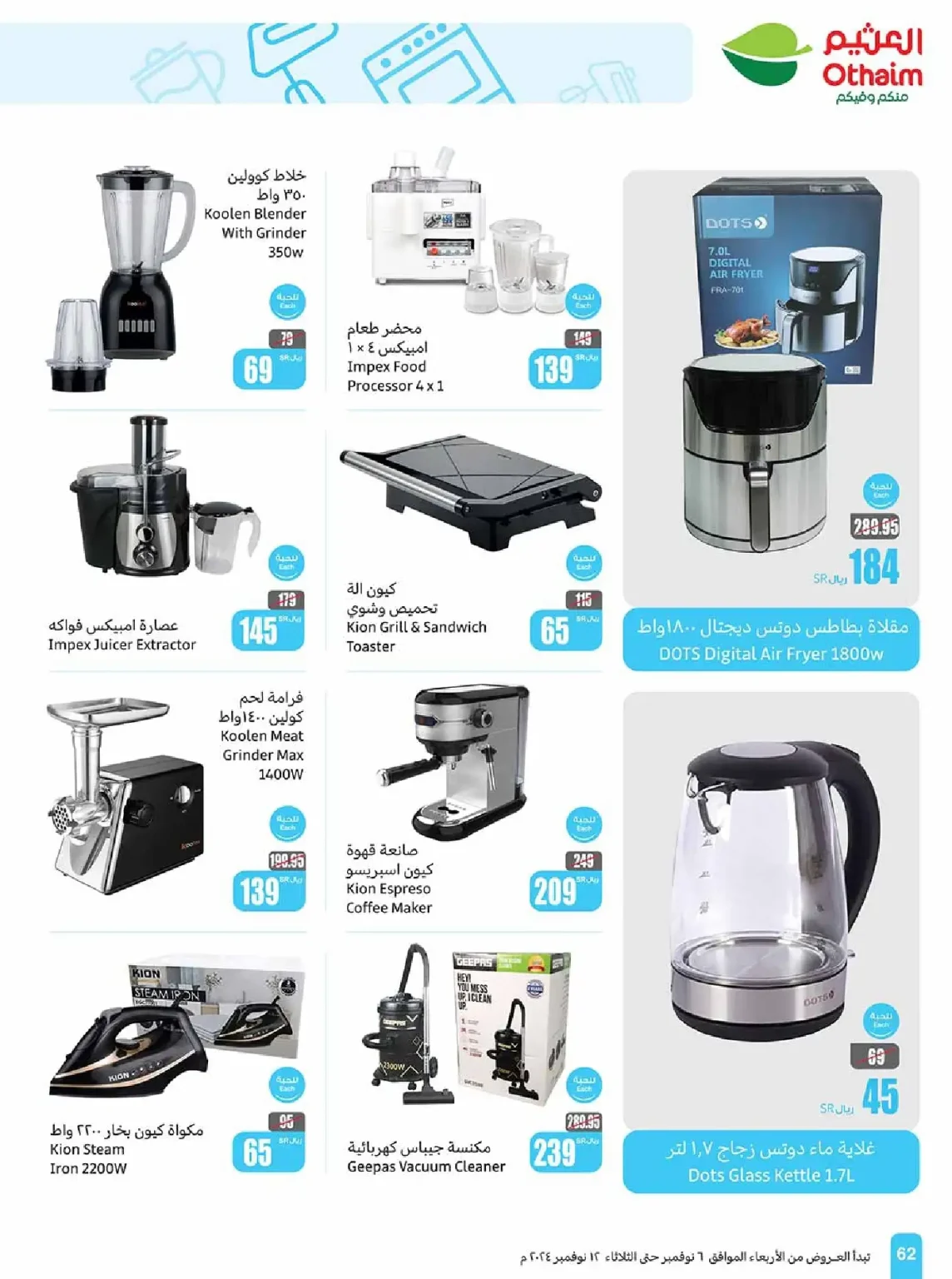 عروض العثيم تتسع أيضا لتشمل الأجهزة المنزلية الضرورية مثل محضرات الطعام والعصارات والخلاطات مما يسهم في تسهيل عملية الطهي وإعداد العصائر الطازجة و تتضمن العروض أيضا قلايات هوائية من فيف هوم ودوتس التي تعد بديلا صحيا لتحضير الأطعمة