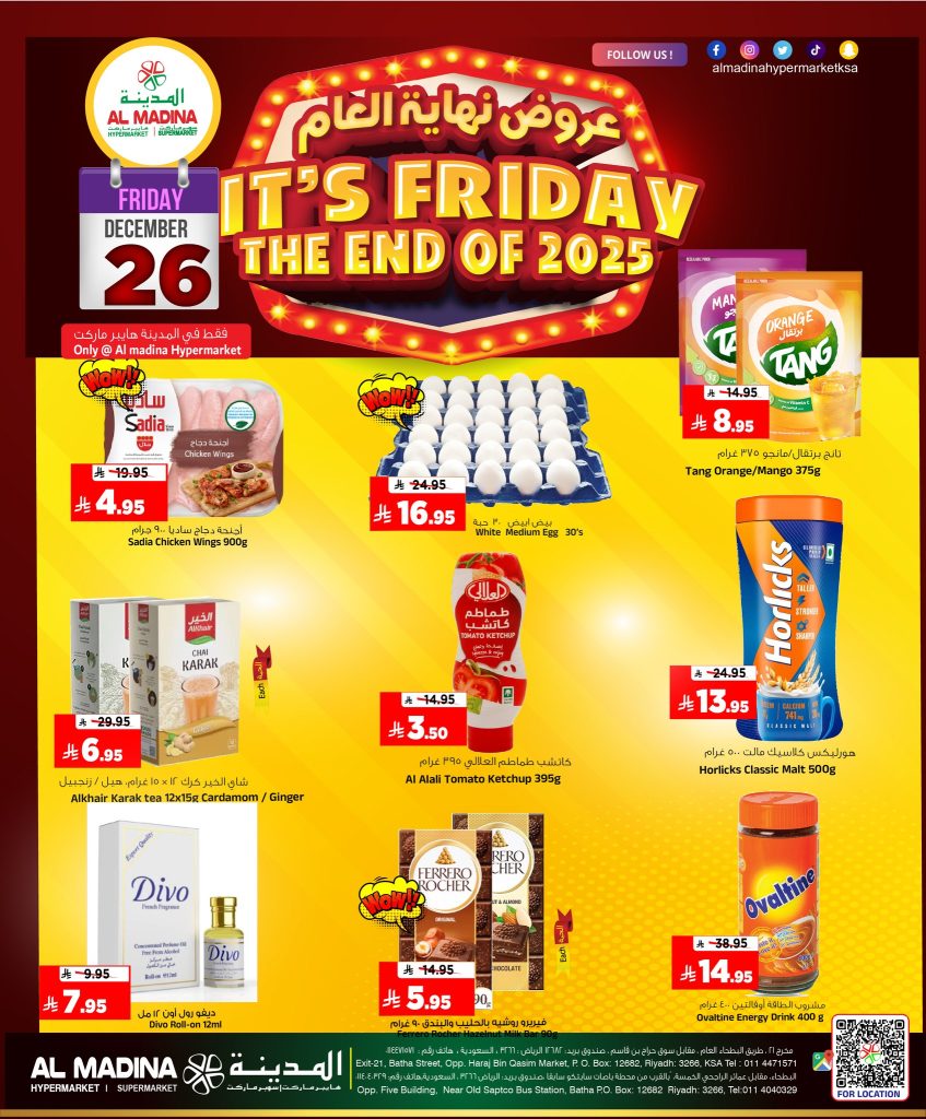 عروض المدينة هايبر ماركت الويكند بتقدم ليكم اليوم الجمعة 6 رجب 1447هـ مجموعة من المنتجات و تشمل أجنحة دجاج ساديا وبيض أبيض طازج في طبقات مرتبة ومسحوق عصير تانج بنكهات البرتقال والمانجو إلى جانب شاي الكرك بالحبهان من الخير وصلصة كاتشب العلالي وزجاجة عطرية من ديفو رول أون بالإضافة إلى الخضار والفواكه