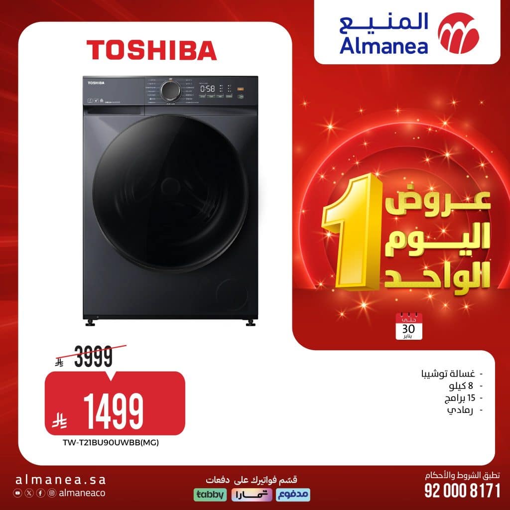 • غسالة ملابس توشيبا (8 كيلو – 15 برنامج): 1499 ريال