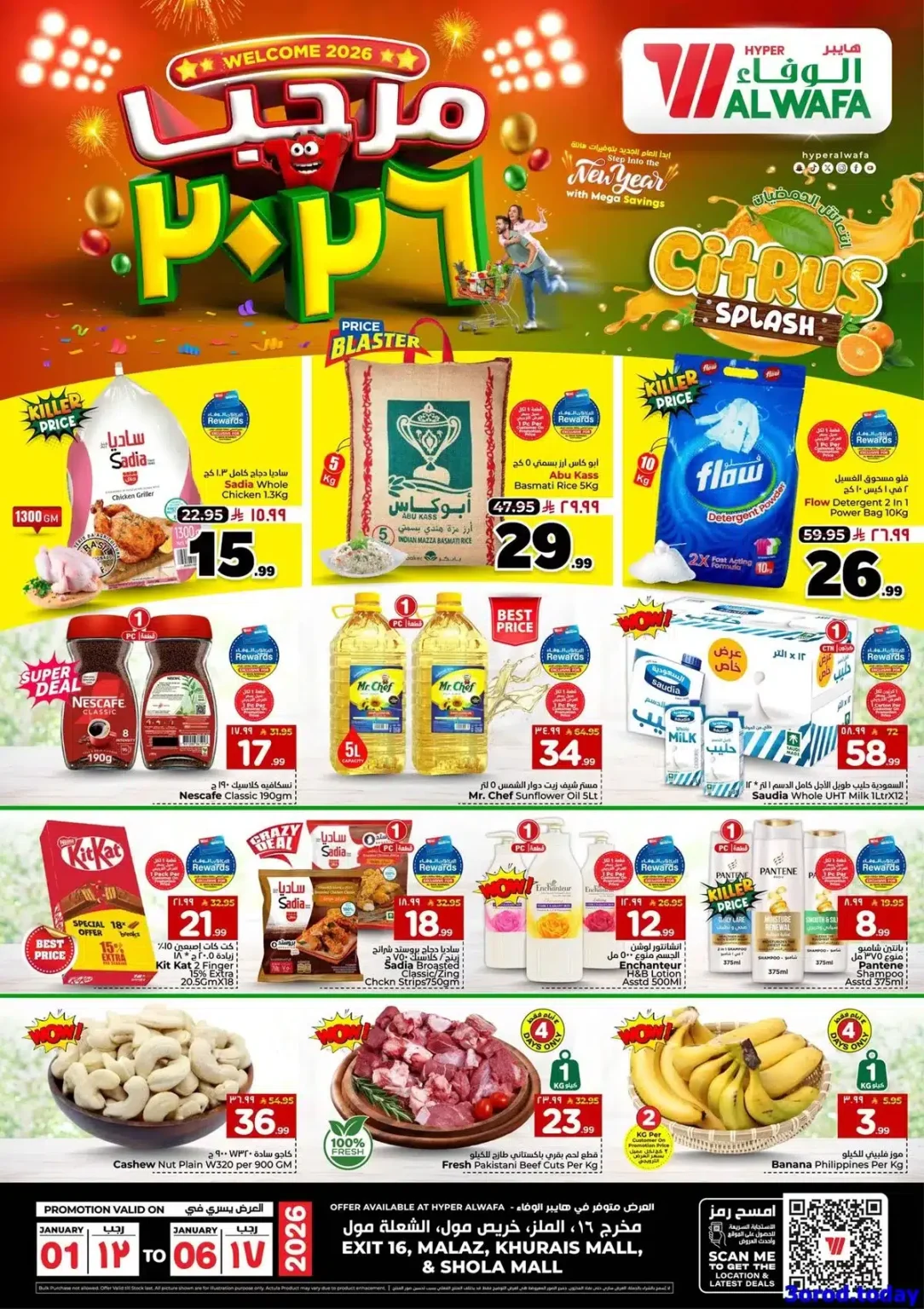 عروض الوفاء هايبر ماركت الأربعاء 11 رجب 1447هـ الموافق 31-12-2025 تركز على المنتجات الغذائية و تضم الأرز والمعكرونة والحمص المطحون وزيت دوار الشمس وصلصة الطماطم المتنوعة ثم تضيف أجهزة كهربائية مثل مروحة حائط وسخان شاي كهربائي وخلاط عصائر وفرن تحميص وجهاز خفق و متنوع من ادوات تحضير الطعام