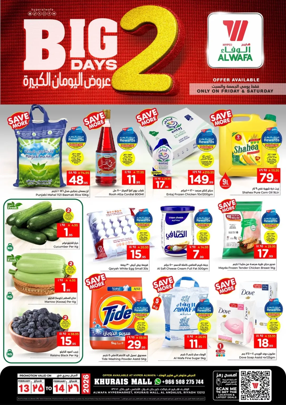 عروض الوفاء هايبر ماركت الجمعة 13-2-2026 الموافق 25 شعبان 1447 و تحتوي علي تخفيضات متنوعة على السلع الغذائية الأساسية كالزيت والأرز والدجاج والخضروات ومنتجات العناية بالبشرة