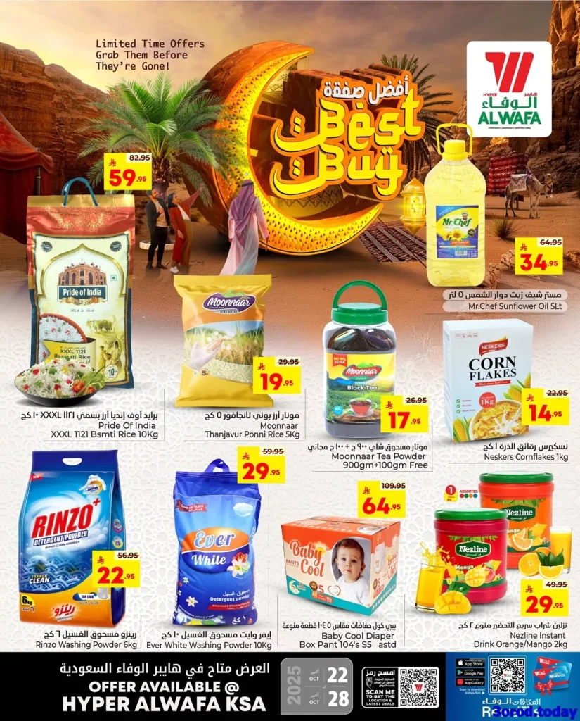 عروض الوفاء هايبر ماركت الخميس 1 جماد الاول 1447هـ تقدم تشكيلة من الأجهزة المنزلية والإلكترونيات منها محضرات الطعام والخلاطات وأجهزة تسخين المياه والشواحن المحمولة و بتوفر كمان أجود أنواع الأرز والزيوت والشاي والسيريال وغيرها من المكونات الأساسية تابعونا علي موقعكم عروض توداي لمعرفة كل جديد