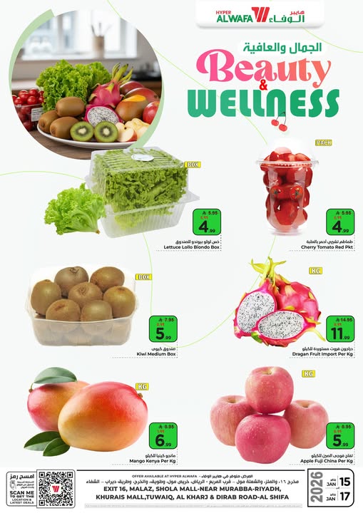 عروض الوفاء هايبر ماركت الرياض 3 ايام 15 يناير 2026 اقوى عروض الطازج على الفواكه و الخضروات ذات الجودة العالية و بأفضل الاسعار العروض متوفره من 15 حتى 17 يناير 2026 فقط لا تفوتوا العروض في فوع الوفاء هايبر ماركت في الرياض مخرج 16 و ملاز و شولا مول وخريس مول وتويق والخرج والشيفة