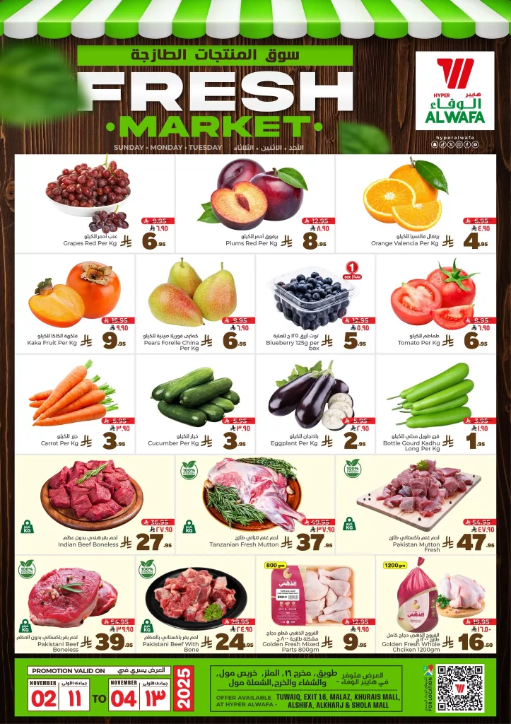 عروض الوفاء هايبر ماركت الأحد 2-11-2025 تقدم تشكيلة واسعة من الفواكه والخضار الطازجة مثل العنب الأحمر والبرقوق والبرتقال والفلفل الرومي والطماطم والباذنجان والجزر بالإضافة إلى منتجات اللحوم الطازجة والدواجن مثل لحم الغنم الطازج والدجاج الكامل ومجموعة مختارة من اللحوم المجمدة والدجاج المقطع والخضروات