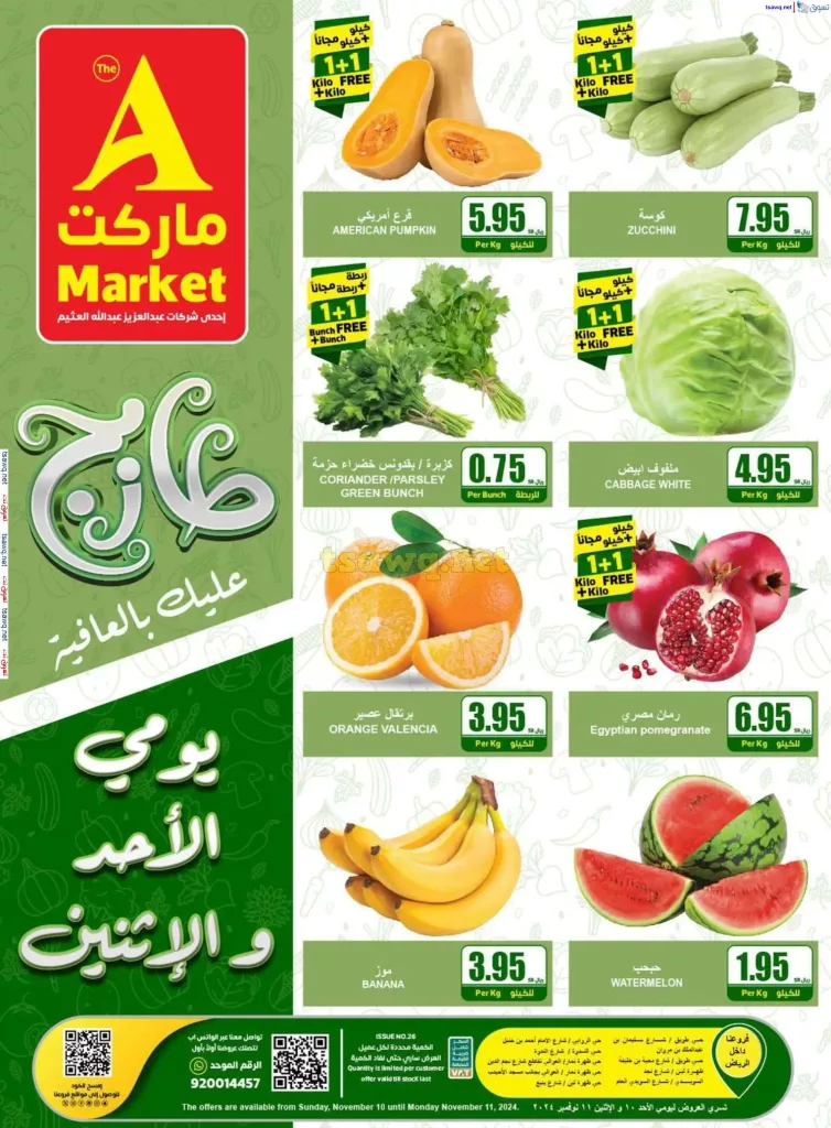 كما تتميز عروض أيه ماركت الرياض بتقديم عروض مميزة على الفواكه والخضروات الطازجة لتوفر لعملائها منتجات صحية وطازجة بأفضل الأسعار بدءا من القرع الأمريكي والكوسة مرورا بملفوف الأبيض والرمان المصري جميعها متاحة بخصومات رائعة تناسب كل أفراد العائلة.