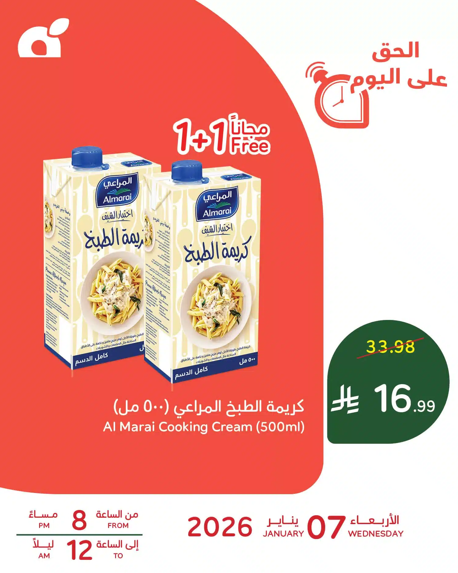 - سعر كريمة الطبخ المراعي 500 مل بـ 17 ريال سعودي – 1+1 مجانا