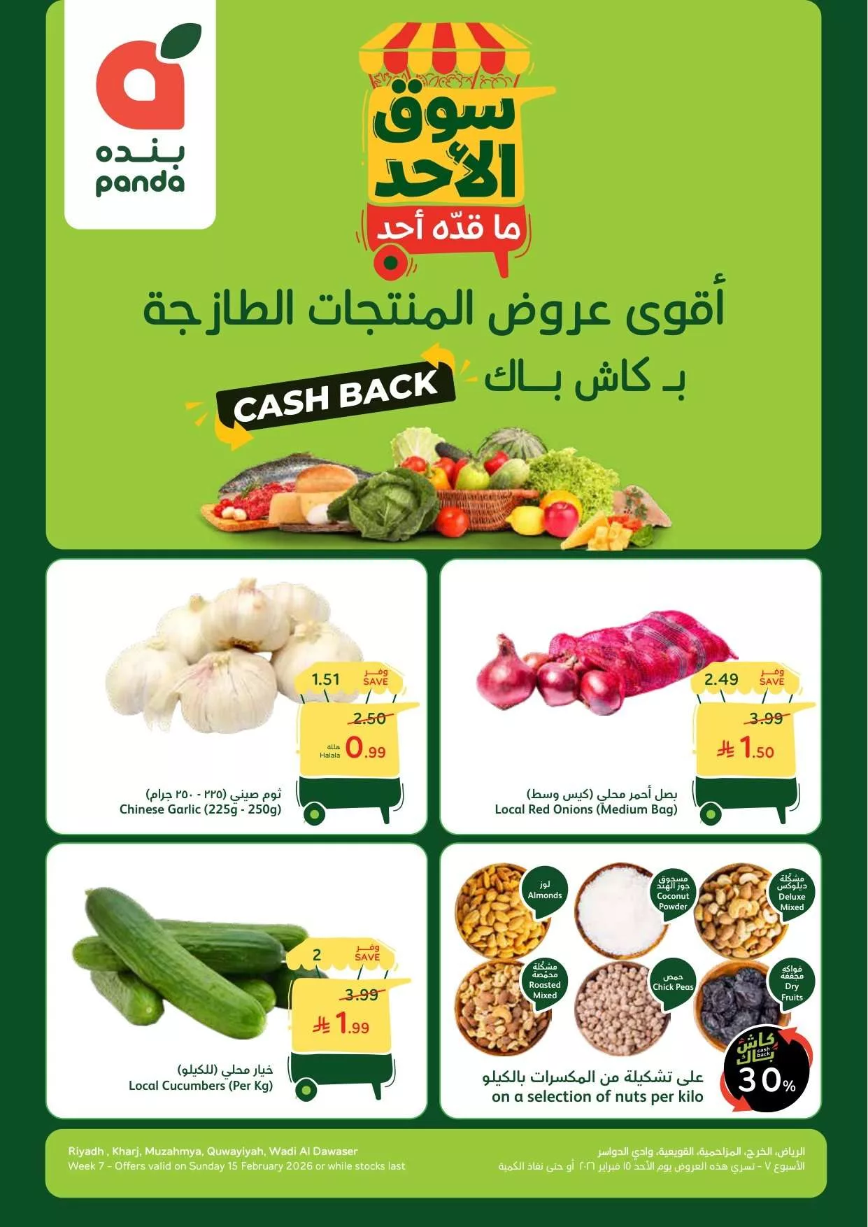 عروض بنده الطازج الاحد 15-2-2026 – 27 شعبان تحتوي علي تشكيلة من المنتجات الطازجة منها الخضروات الطازجة كالثوم والبصل والخيار والجزر والفلفل والبطاطا الحلوة بالإضافة إلى الفواكه كالعنب الأبيض