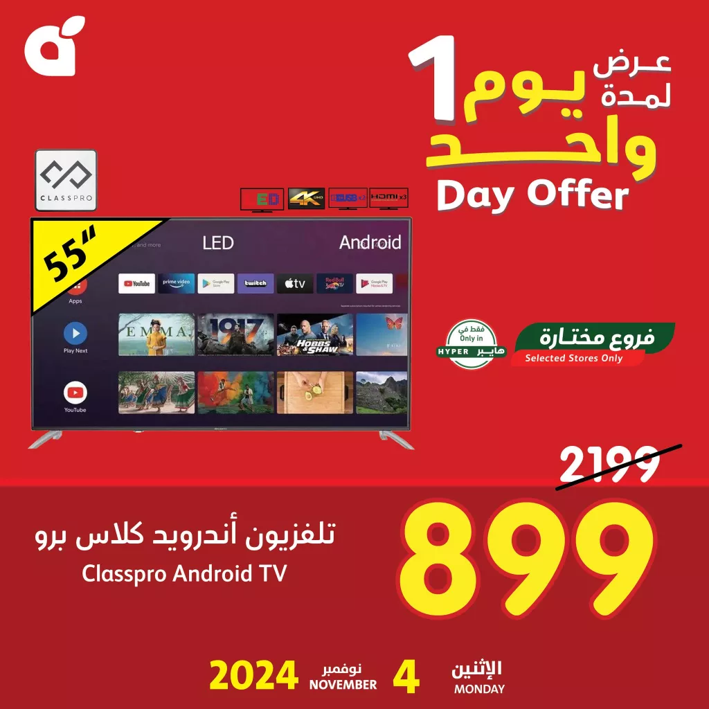 عروض بنده الاثنين 4 نوفمبر 2024 و استمتع بعرض يوم واحد فقط على مجموعة من الأجهزة الإلكترونية بتخفيضات كبيرة في الأسعار مما يتيح لك فرصة الاستفادة من منتجات ذات جودة عالية بأسعار مناسبة و يقدم العرض تشكيلة من الشاشات الذكية بأحدث التقنيات مثل شاشات كلاس برو الذكية بتقنية 4K