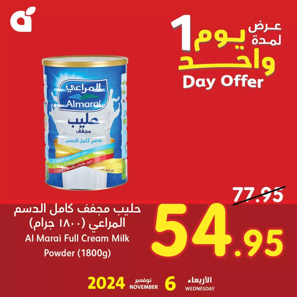 • حليب مجفف كامل الدسم المراعي (1800 جرام): 54.95 ريال سعودي بعد الخصم