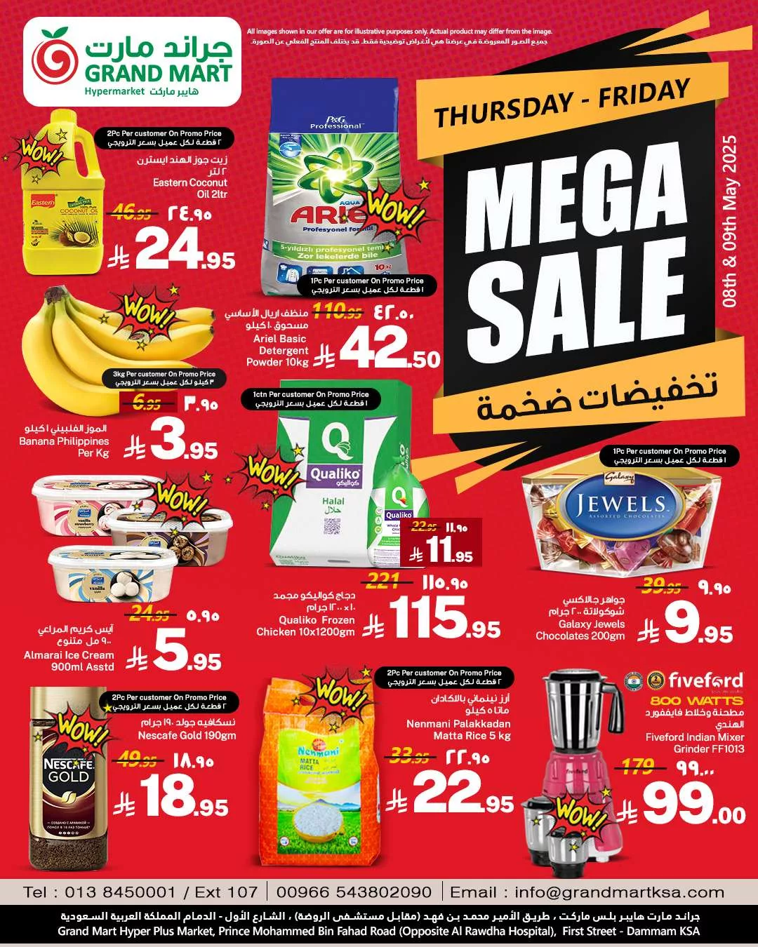 عروض جراند مارت الدمام الخميس 8 مايو 2025 و تشمل التخفيضات تشكيلة مميزة من السلع الغذائية الأساسية مثل الأرز والسكر والزيت والحليب المجفف بالإضافة إلى عروض رائعة على الخضار والفواكه الطازجة مثل البطاطس والطماطم والموز والتفاح وتوفر السوق أيضًا تشكيلة مختارة من التمور والأجبان والحلويات