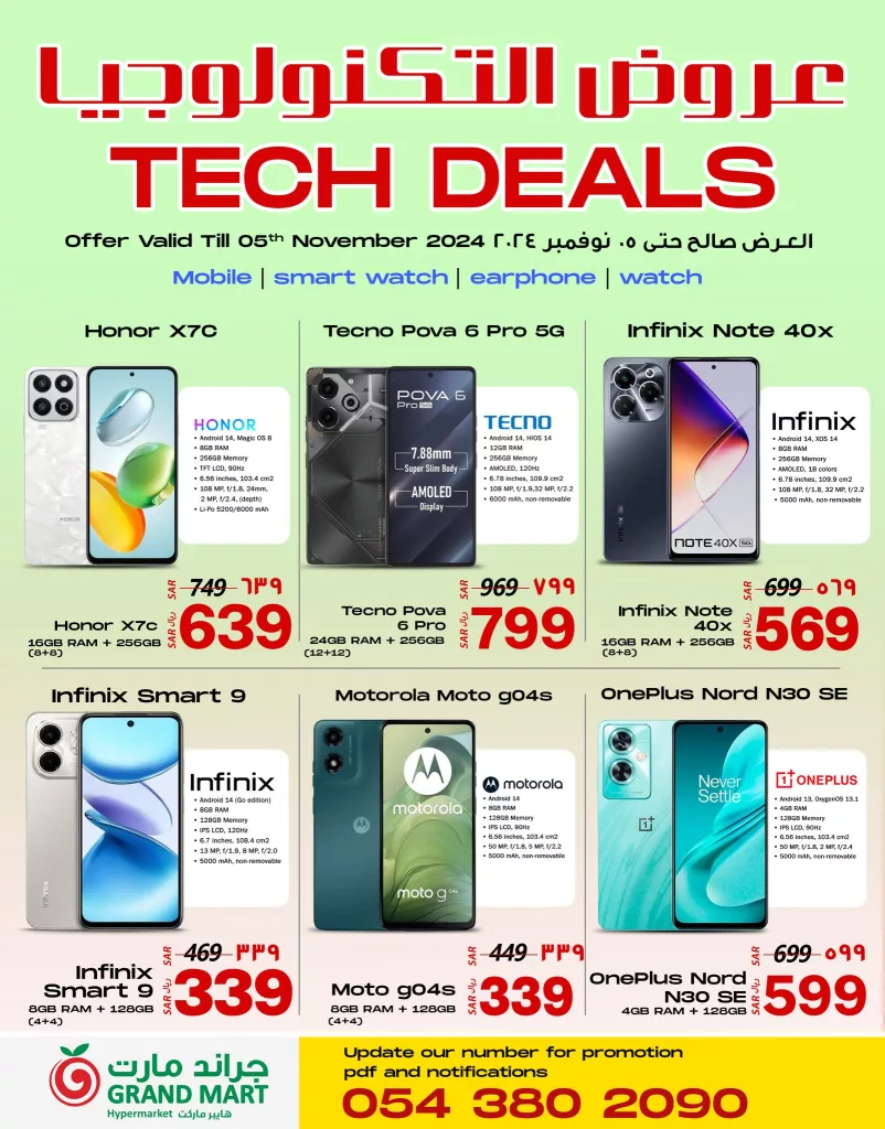 تقدم عروض جراند مارت أيضا خيارات متعددة للهواتف الذكية بتقنيات الاتصال بالجيل الخامس وشاشات AMOLED، وكاميرات متقدمة تضمن تجربة تصوير مميزة هذا بالإضافة إلى بطاريات قوية تدوم طويلا لتلبية احتياجات المستخدمين اليومية وذاكرة رام وسعة تخزين تكفي لتشغيل التطبيقات الحديثة والألعاب بسلاسة