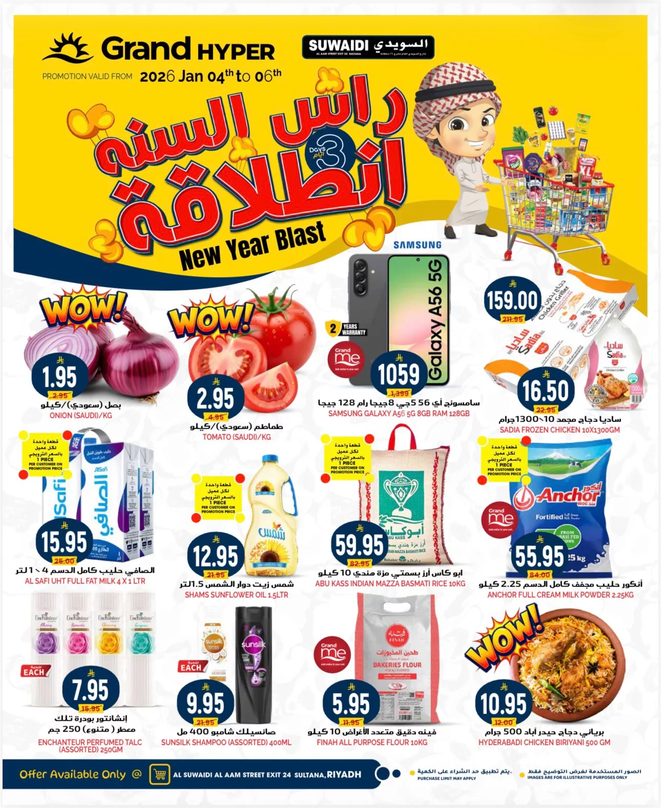 عروض جراند هايبر الرياض بتقدم ليكم الاحد 15-7-1447هـ الموافق 4 يناير 2026 تشكيلة من المنتجات منها الخضروات والفواكه الطازجة مثل البصل والطماطم والتفاح والفراولة والبرتقال والذرة والبطاطس والليمون والكرنب مع الزيوت النباتية والأرز والشامبو والدجاج والأجهزة الإلكترونية و باسعار مميزة لفترة محدودة