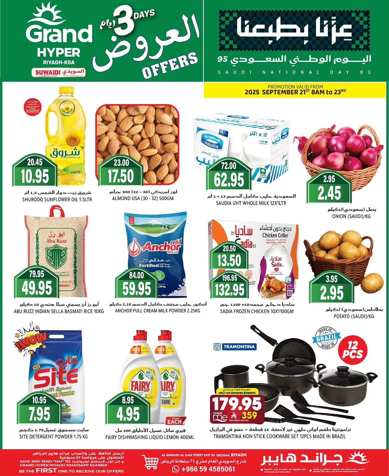 تستمر عروض جراند هايبر الرياض الأحد 21 سبتمبر 2025 بتقديم تخفيضات على مجموعة واسعة من المنتجات الغذائية والمواد الاستهلاكية تشمل الفواكه والخضروات الطازجة بالإضافة إلى الخضروات باقل الاسعار المناسبة للجميع بمناسبة اليوم الوطني السعودي 95 و تضم أيضا مجموعة متنوعة من الأطعمة المعلبة والمنتجات الجاهزة