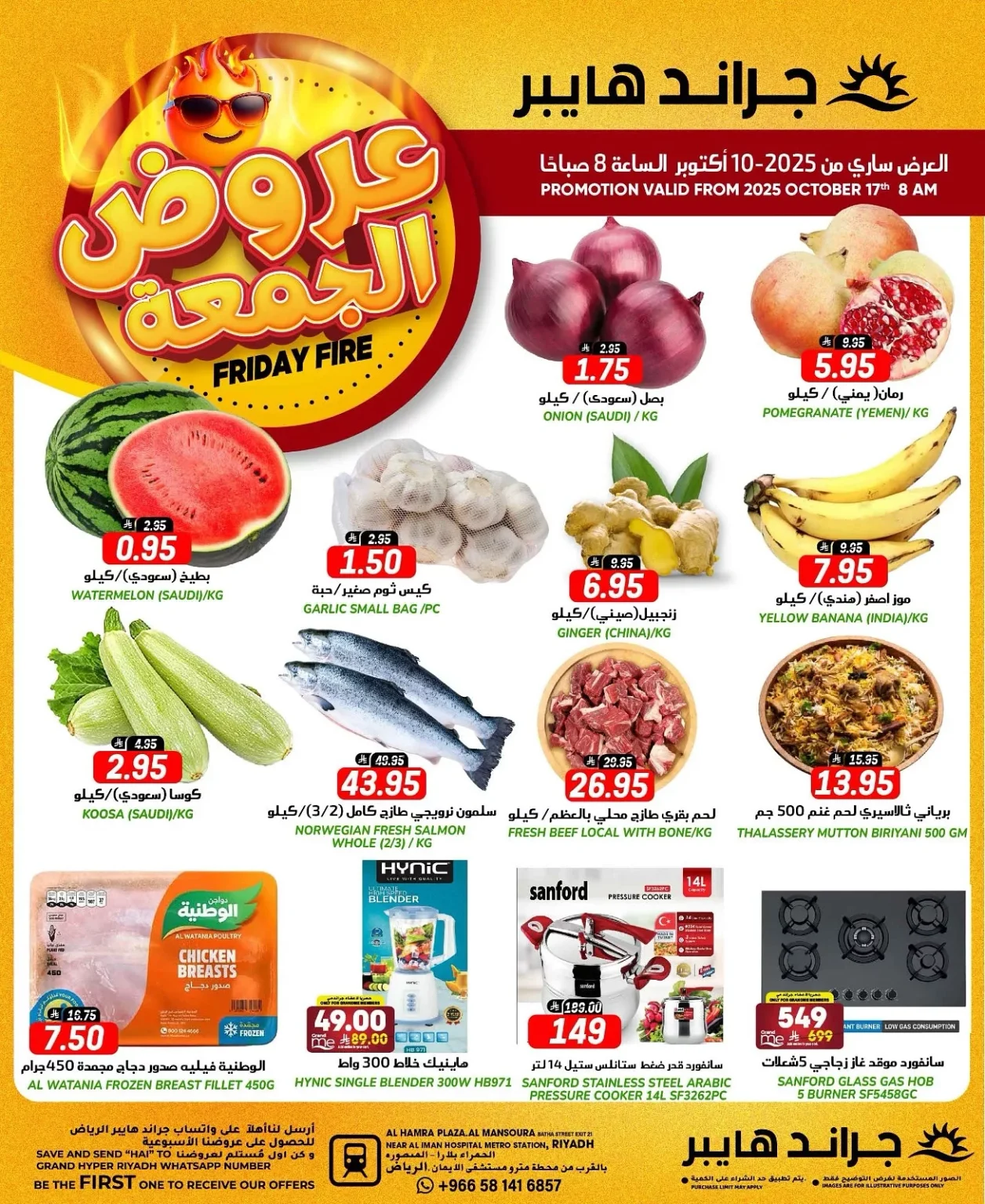 عروض جراند هايبر الرياض الجمعة 17 اكتوبر 2025 تقدم تشكيلة متنوعة من المنتجات الطازجة والخضراوات والفواكه منها البطيخ السعودي والبصل السعودي والرمان اليمني والموز الهندي والكوسا والثوم والزنجبيل الطازج و بتوفر كمان صدور الدجاج المجمدة من الوطنية ومنتجات البرياني الهندي الجاهز باقل الاسعار