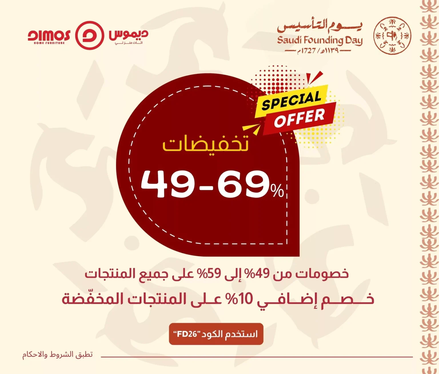 عروض ديموس للأثاث خصومات حتى 69% بمناسبة يوم التأسيس احتفلوا معنا بيوم التأسيس بعروض استثنائية ولا تفوت استفيدوا من اقوى التخفيضات الكبرى في ديموس المختص بأفضل انواع الاثاث في المملكة خصومات من 49% إلى 59% على جميع المنتجات مع خصم إضافي 10% على المنتجات المخفضة بأستخدام الكود FD26