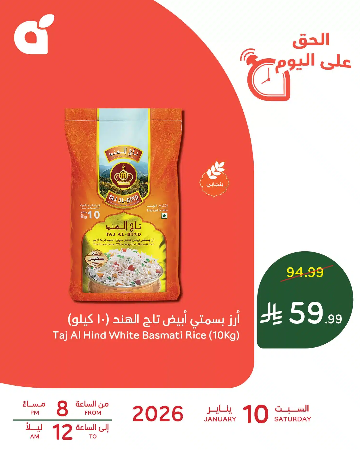 بنقدم ليكم الوم احدث عروض بنده السبت 10 يناير 2026 – 21 رجب 1447هـ بمناسبة شهر رمضان الكريم بتقدم عروض يومية تشمل افضل المنتجات و منها اليوم ارز بسمتي ابيض تاج الهند في صفقة حصرية باقل الاسعار متاح اليوم فقط و لساعات محدودة في عروض رمضان اليومية من بنده السعودية ابقوا معنا .