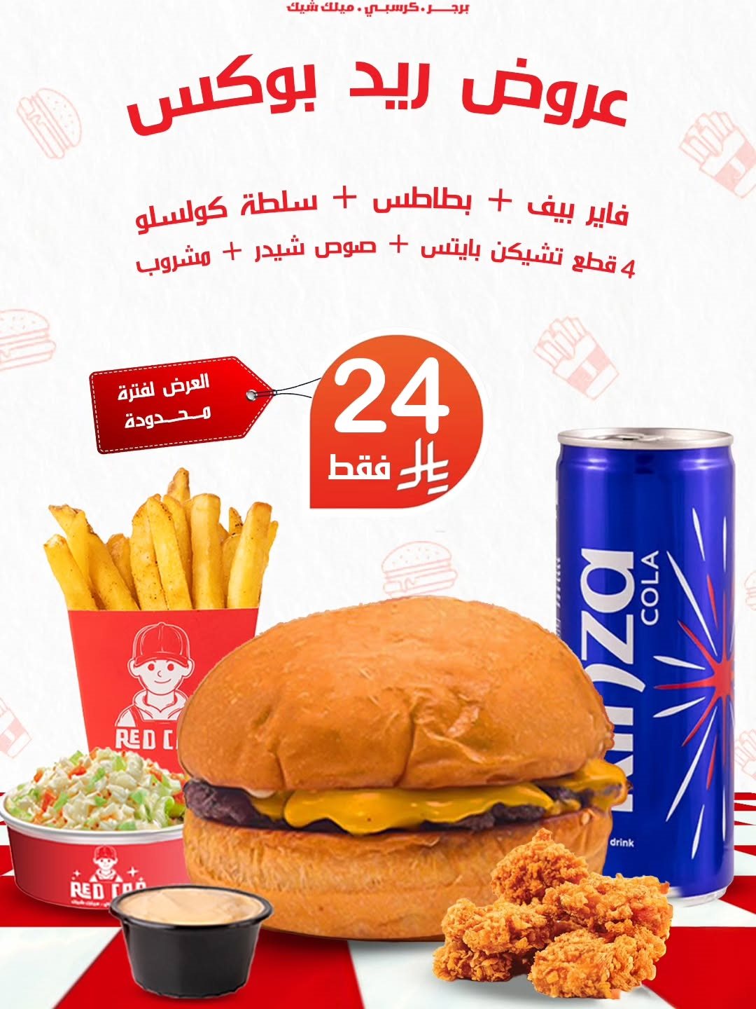 شاركها فيسبوك تويتر لينكدإن بينتيريست تيلقرام البريد الإلكتروني عروض مطعم ريد كاب برجر سعر وجبة ريد بوكس بـ 24 ريال سعودي تتكون الوجبة من نييورك سنجل و بطاطس و سلطة كولسلو 4 قطع تشيكن ناجتس و صوص شيدر و مشروب العرض متاح لفترة محدودة فقط