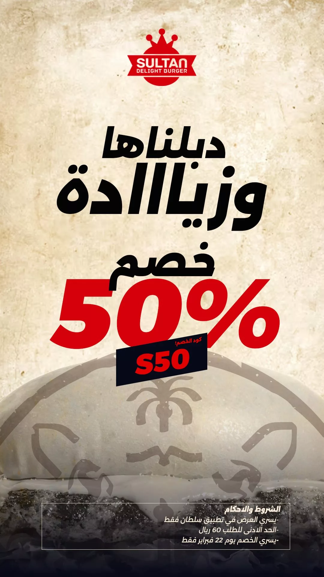 عروض سلطان دي لايت برجر خصم 50% احتفالا بيوم التأسيس السعودي من يوم بدينا والكرم بيدينا شعار المملكة للمجد و العز في مناسبة يوم التاسيس التي نقدم فيها خصم 50% لمدة يوم واحد فقط عبر التطبيق فقط والحد الادنى للطلب 60 ريال العرض ساري في يوم 22 فبراير 2026 فقط كود الخصم S50