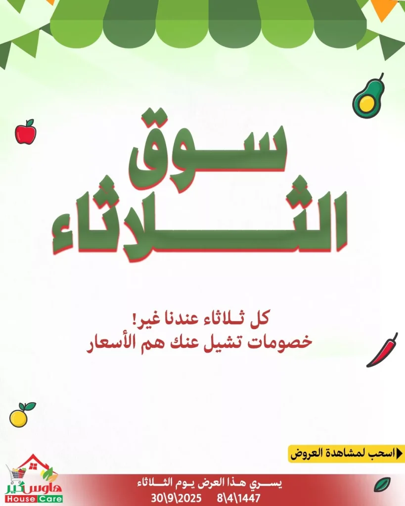 - العروض متاحة ضمن فعالية “سوق الثلاثاء” في هاوس كير، ويستفيد منها العملاء فقط يوم الثلاثاء الموافق 30/9/2025م – 8/4/1447هـ.