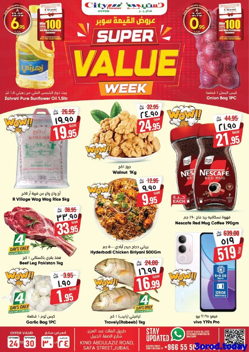 عروض سيتي فلور الجبيل الأسبوعية الأربعاء 2 ربيع الآخر 1447هـ تقدم خصومات على الأسماك البحرية الطازجة كالناجل والهامور والروبيان بجانب اللحوم المبردة والدواجن الكاملة ومنتجات الألبان كالجبن المبشور والحليب طويل الأجل والزبادي والخضروات كالطماطم والبصل الأحمر والبروكلي والفواكه كالمانجو والأناناس والعنب الأبيض