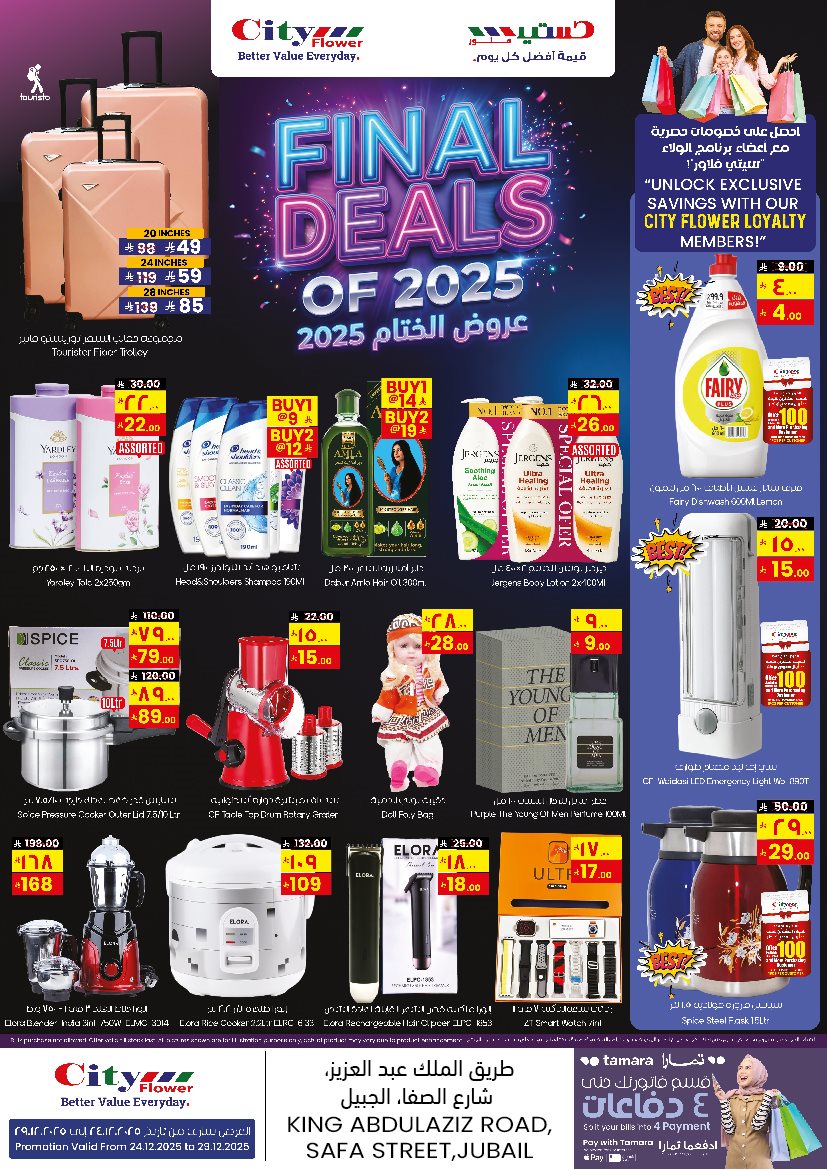 عروض سيتي فلور الجبيل الأربعاء 24 ديسمبر 2025 تبدأ بالأجهزة مثل غلاية ماء وخلاط كهربائي ومقلاة وماكينة تحميص ومكواة بخار خفيفة ثم تضم الأغذية الطماطم والخيار والبطاطس البيضاء والتفاح والموز المستورد والفراولة وزيت الذرة والأرز الأبيض و تشكيلة من المنتجات و الاجهزة الاخري و باقل الاسعار المناسبة للجميع
