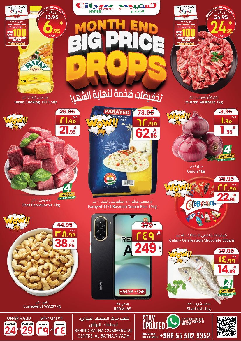 عروض سيتي فلور الرياض الأربعاء 24 ديسمبر 2025 تبدأ بالأغذية التي تشمل الفجل والبصل والبطاطا الجديدة والمانجو والتفاح وشراب القيقب الطبيعي وزيت السمسم والعسل الأبيض ثم تمتد إلى الأجهزة مثل قدر حديدي للفرن ومفرمة خضار وسخان أطعمة منزلي وصينية شوي معدنية وغيرها من المنتجات و بارخص الاسعار