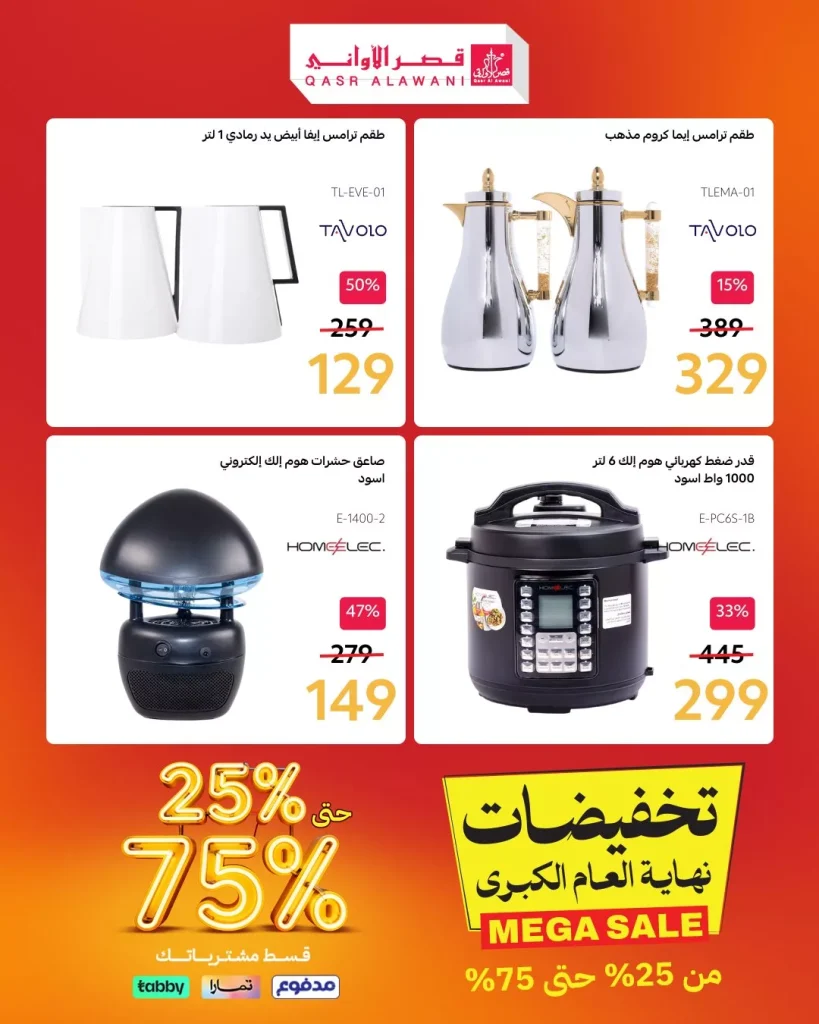 نستعرض لكم احدث عروض قصر الاواني و تشمل علي أطقم الترامس العصرية و تشمل أيضا تشكيلة مميزة من أجهزة المنزل الكهربائية بين شوايات منزلية وأجهزة تحميص ومكانس متطورة ومضخات غسيل بالضغط العالي إضافة إلى قدور الضغط الكهربائية وسخانات الماء والفواحات العطرية وأجهزة توزيع المياه الساخنة وماكينات التنظيف