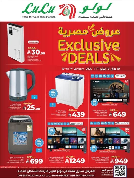 عروض لولو الدمام الحصرية من 15 حتى 17 يناير 2026 هذه العروض المميزه على منتجات مختارة في لولو الشاطئ الدمام فقط و فيها منتجات متنوعة و بأسعار منافسة لمدة 3 ايام الخميس و الجمعة و السبت فقط لا تفوتوا كل ما هو جديد في اسواق هايبر لولو الدمام.